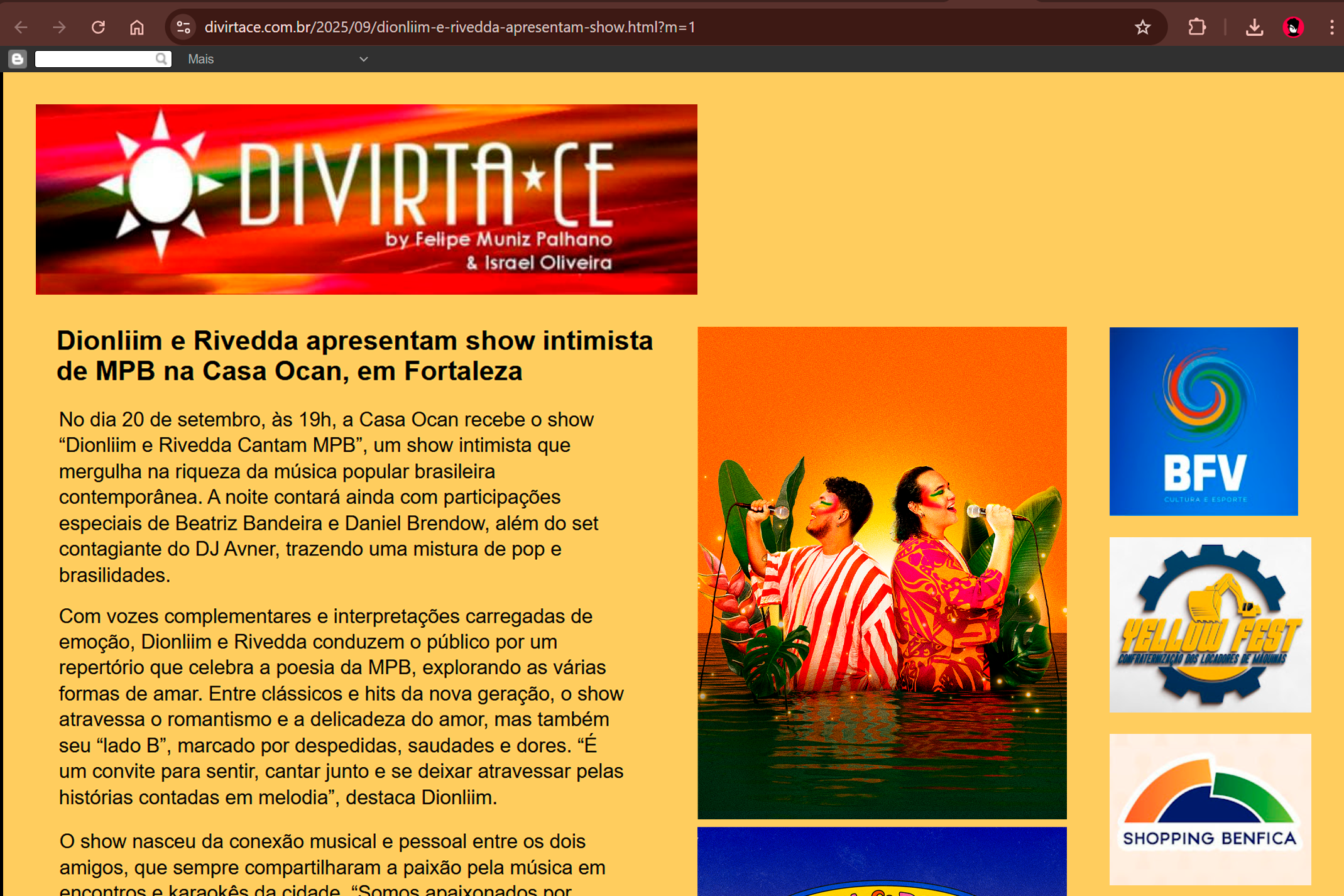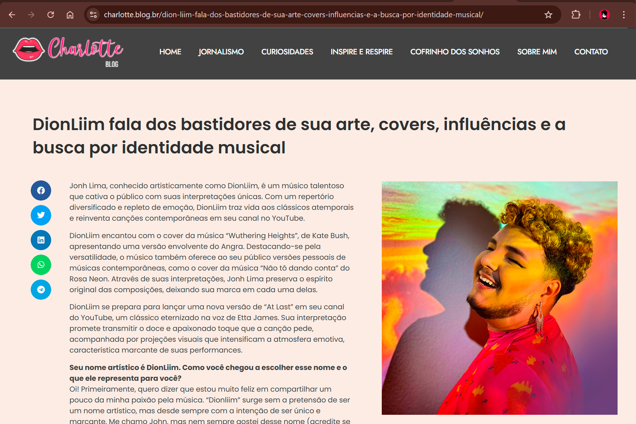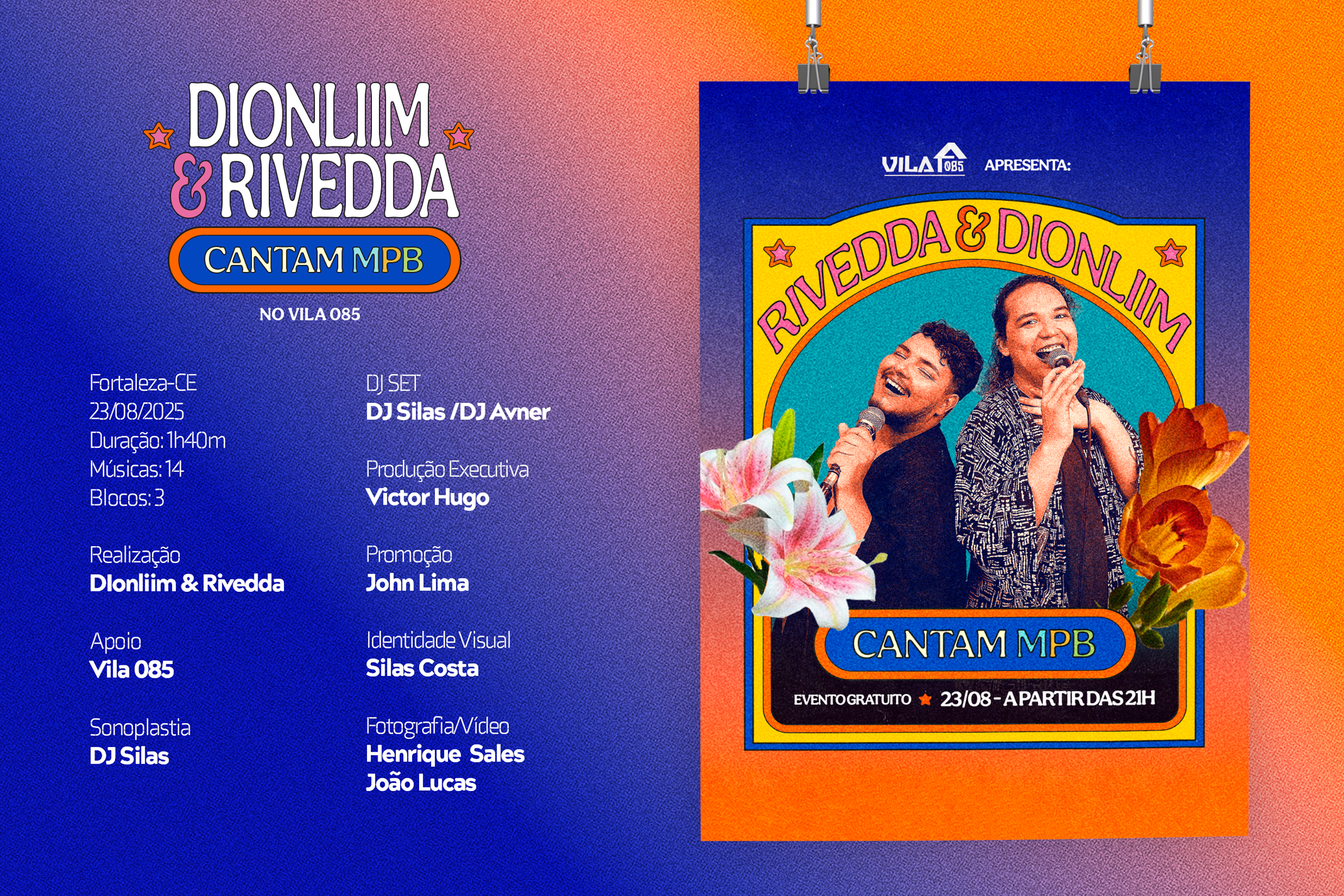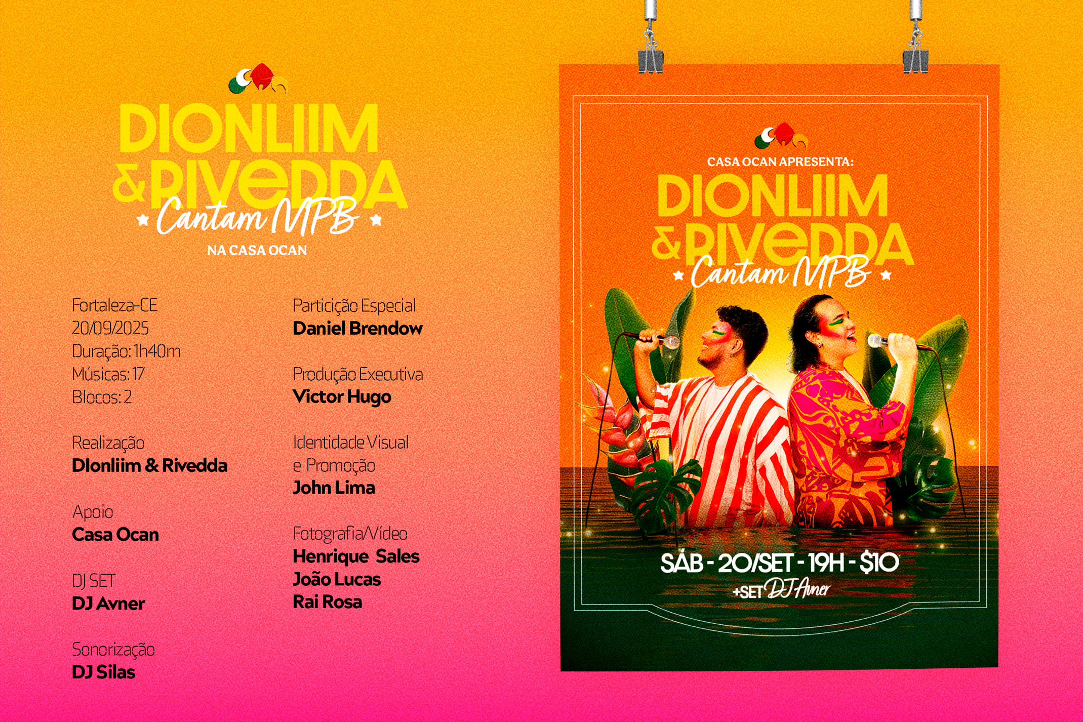 John Lima, que assina artisticamente como Dionliim, é cantor e artista visual natural de Itapipoca, Ceará, e residente em Fortaleza. Transforma som e imagem em experiências autênticas, unindo emoção e identidade em cada trabalho. Movido pela nostalgia e resgate de sonoridades, realiza covers e apresentações que revelam sua sensibilidade artística. Além do palco, atua como designer gráfico, fotógrafo e diretor audiovisual, explorando estética e narrativa em diferentes linguagens.